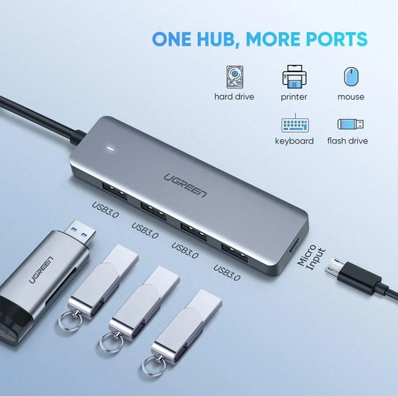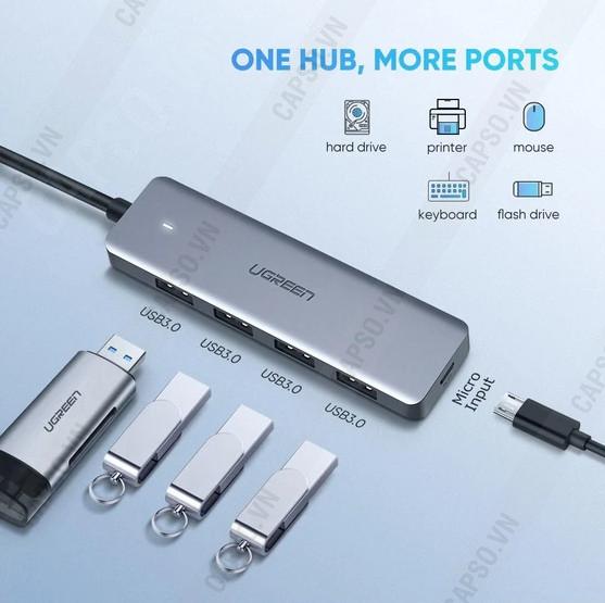 Bộ chia USB Type-C sang 4 cổng USB 3.0 Ugreen 70336, có cổng trợ nguồn Micro USB