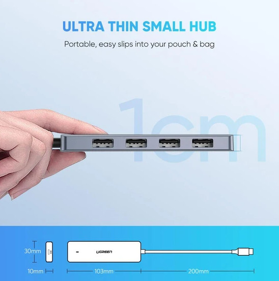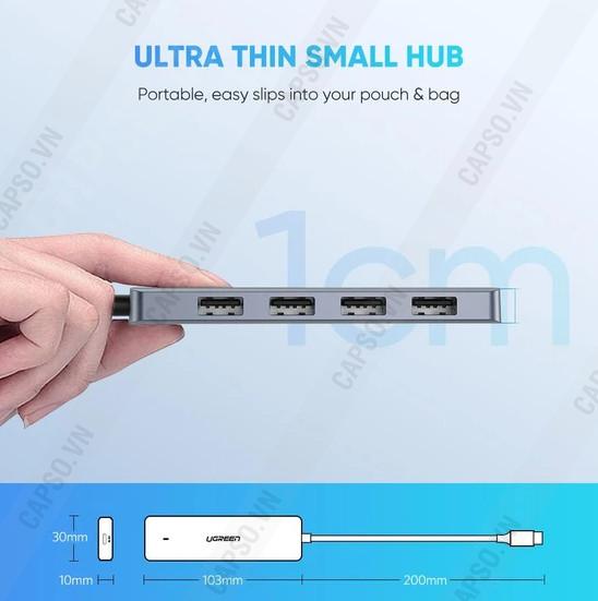- Bộ chuyển USB Type-C sang USB 3.0 Ugreen 70336 là bộ phụ kiện hoàn hảo dùng cho Laptop, Macbook, Smartphone, Máy tính bảng... có cổng USB-C của bạn, cho phép mở rộng thêm 4 cổng USB 3.0 tốc độ cao lên đến 5Gbps cho phép bạn kết nối các thiết bị ngoại vi như chuột, bàn phím, ổ cứng di động, đầu đọc thẻ nhớ và các thiết bị USB khác.
