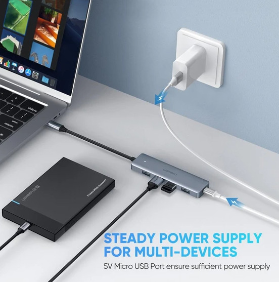 - Hub USB Type-C to USB 3.0 - 4 Port - UGREEN 70336 có cổng trợ nguồn Micro USB bạn sẽ không phải lo ngại việc thiếu nguồn điện để cung cấp cho các thiết bị cần nguồn ổn định như Ổ cứng gắn ngoài.v.v..