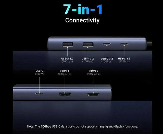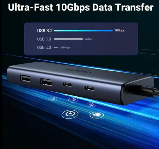 - Tốc độ truyền cực nhanh:Hub USB-C 7 in 1 Ugreen 45379 CM639 đi kèm với hai cổng USB A&C để kết nối bàn phím, chuột và truyền dữ liệu trong USB 3.2. Lưu ý: Các cổng USB A và C không cung cấp khả năng sạc hoặc hỗ trợ truyền âm thanh.