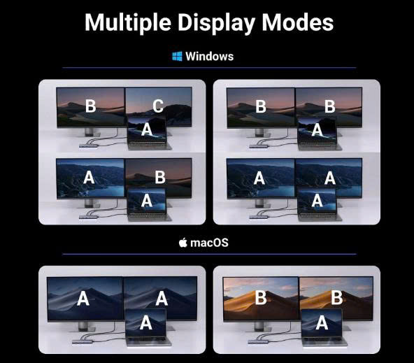 - Dual 4K Docking Station: Dual 4K HDMI Monitor Docking Station hai cổng HDMI 4K@60Hz, cho phép kết nối cùng lúc 2 màn hình 4K@60Hz. Xin lưu ý rằng đầu ra video phải tương thích với giao thức HDMI và Xin lưu ý rằng do hạn chế của MacOS, tất cả các màn hình mở rộng sẽ hiển thị cùng một nội dung khi kết nối MacBook.