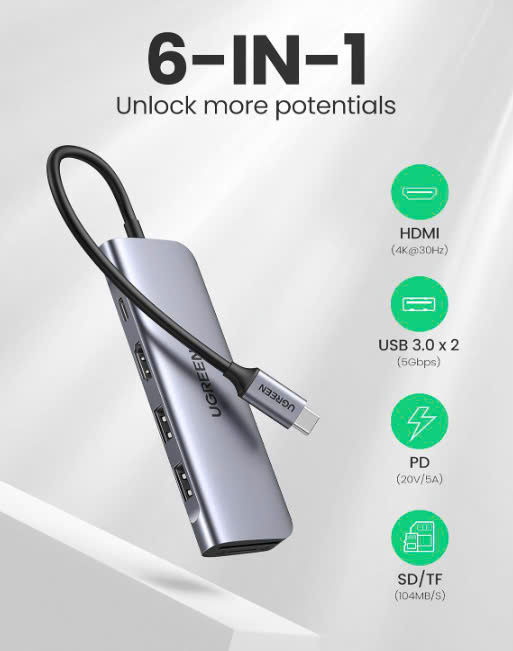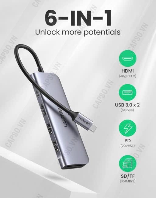 Bộ chuyển USB Type C Sang HDMI + USB 3.0*2 + SD/TF + PD Ugreen 70411