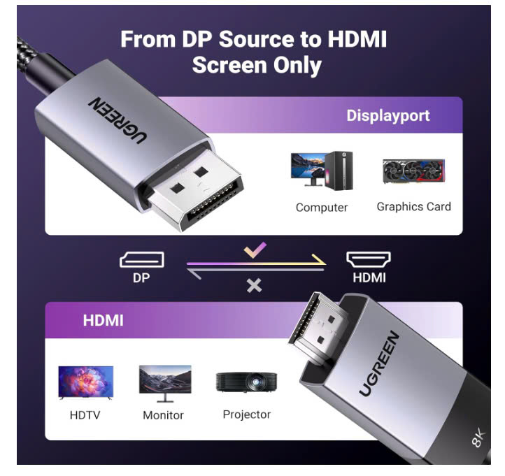 Cáp chỉ hỗ trợ một chiều từ cổng Displayport (PC, Laptop) đến màn hình, máy chiếu cổng HDMI – KHÔNG HỖ TRỢ CHIỀU NGƯỢC LẠI