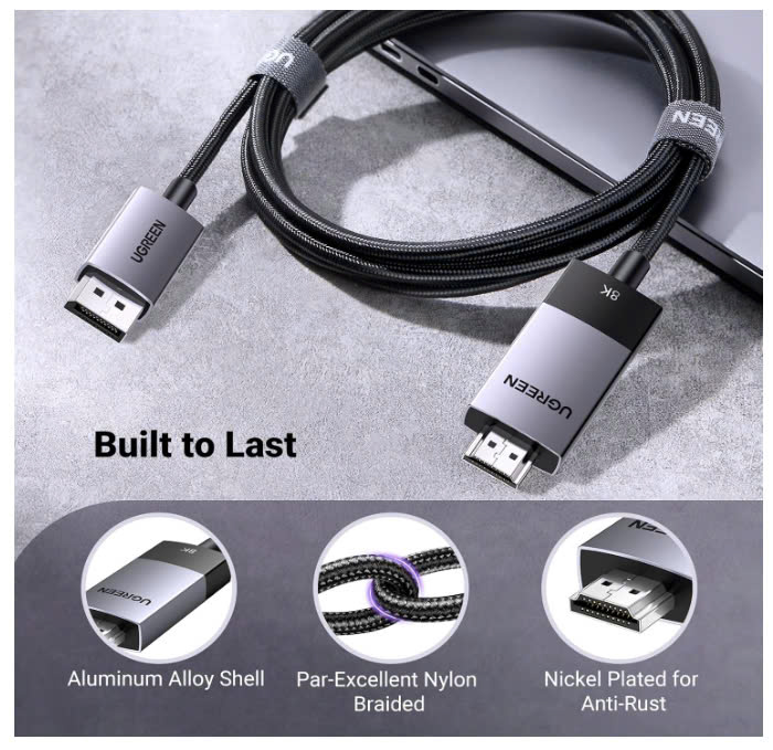 Thiết kế chống nhiễu: Cáp chuyển DP Sang HDMI Ugreen DP115 không có thiết kế khóa bấm, có thể ngăn ngừa hư hỏng do vô tình khi rút card đồ họa. Nó được làm bằng đồng mạ thiếc 28AWG và thiếc có lớp bảo vệ ba lớp và khả năng chống nhiễu điện từ. Vỏ hợp kim nhôm chống gỉ và có thể tăng tốc độ tản nhiệt. Dây này có lớp vỏ bện bằng nylon, bền hơn 10 lần so với nhựa PVC. Nó có thể cung cấp khả năng kết nối cao hơn và tuổi thọ dài hơn để truyền tín hiệu tốt hơn