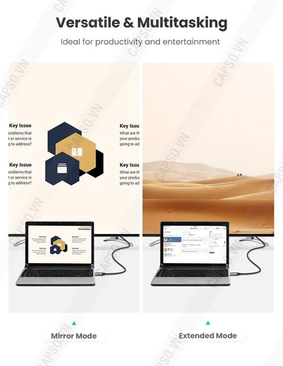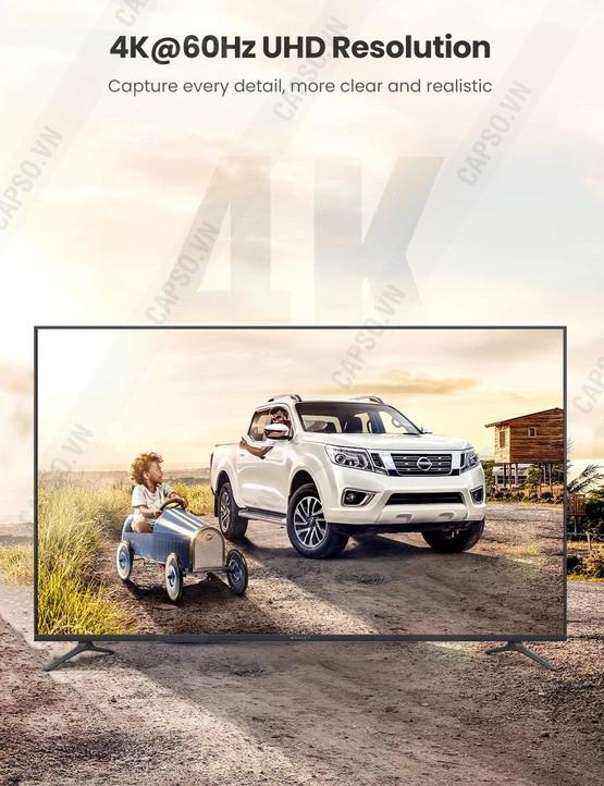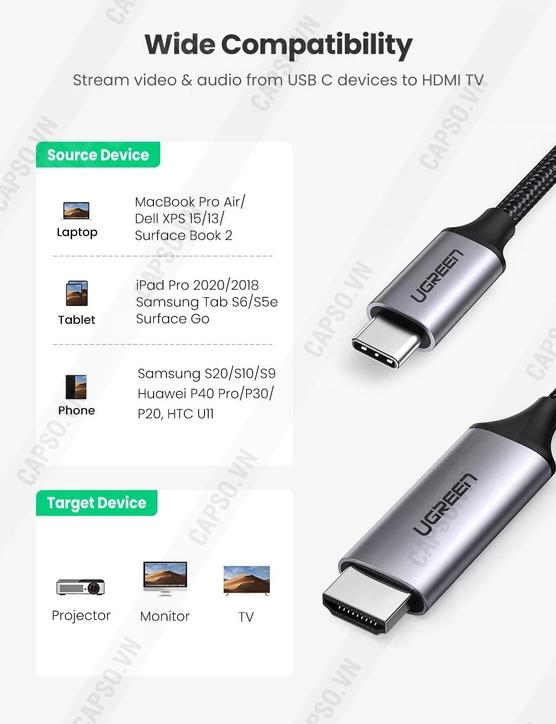 - Cáp chuyển đổi USB Type C sang HDMI cao cấp hỗ trợ 4K Ugreen 50570 giúp kết nối máy tính, laptop có tích hợp cổng USB-C .. với màn hình HDTV, máy chiếu qua chuẩn giao tiếp HDMI, cáp hai đầu cắm trực tiếp từ máy tính, điện thoại với Tivi dài 3m tiện lợi, cắm là nhận mà không cần cài đặt driver hay cấp nguồn . Ugreen 50766 cho hình ảnh và âm thanh sống động sắc nét với độ phân giải hình ảnh tối đa lên đến 4K*2K@60Hz, hỗ trợ trình chiếu 3D.