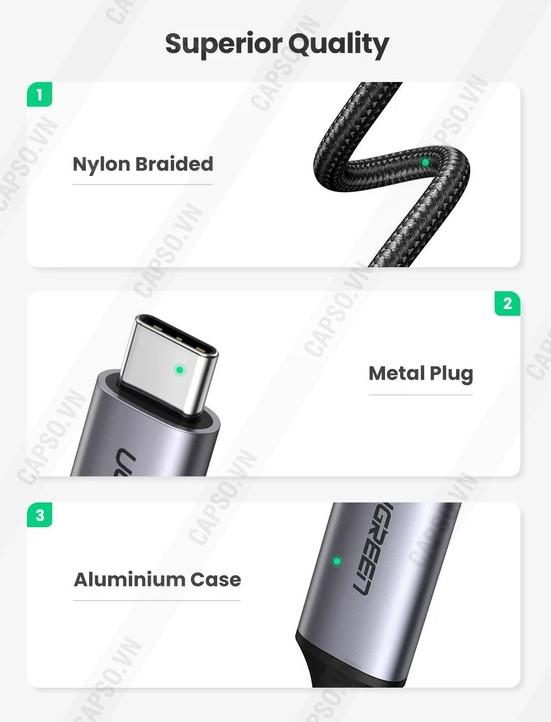 - Cáp kết nối điện thoại USB C với màn hình TV HDMI Ugreen 50570 được thiết kế nhỏ gọn tinh tế với lớp vỏ bằng hợp kim nhôm cao cấp, Các kết nối của Ugreen 50570 được mạ vàng 24K cùng lõi đồng nguyên chất 100% mang đến khả năng truyền tải tín hiệu ổn định cho thiết bị, ngoài ra, các vật liệu này còn giúp Ugreen 50570 có tính kháng Oxy hoá theo thời gian dài sử dụng.