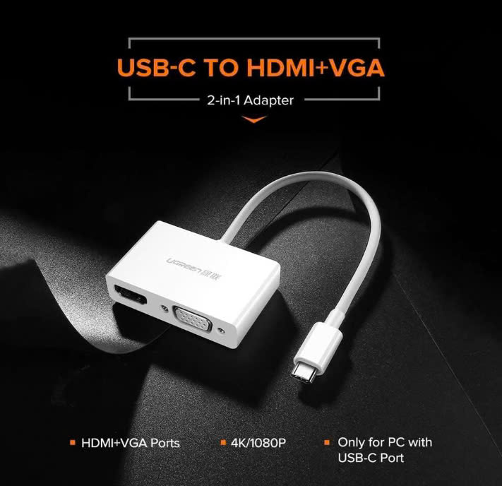 Cáp chuyển USB Type C sang HDMI và VGA là sản phẩm chính hãng của thương hiệu UGREEN với sự kết hợp 2 sản phẩm là cáp USB C sang HDMI và sang VGA. Đối với các dòng ti vi và máy chiếu hiện nay thì cổng HDMI và VGA được trang bị khá nhiều. Tuy nhiên không phải lúc nào các thiết bị trên cũng có sẵn cả 2 cổng cắm. Nếu ti vi ở nhà cổng HDMI bạn dùng được nhưng khi mang đi sử dụng cho máy chiếu VGA thì sẽ lại không đc khá là bất tiện