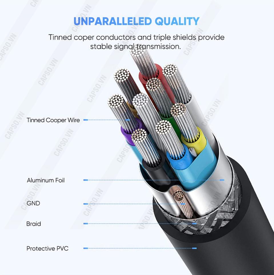 Thiết kế cao cấp với đầu USB C có lớp bảo vệ 3 lớp (bao gồm áo khoác PVC, dây bện, lá nhôm), dây dẫn đồng trần và đầu nối chống oxy hóa, mang lại hiệu suất vượt trội và truyền dữ liệu không bị lỗi. Thiết kế khớp nối dây kéo dài giúp loại cáp này chống lại lực kéo và căng thẳng và bền hơn.