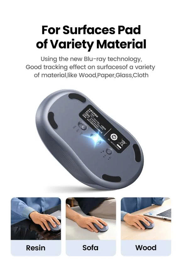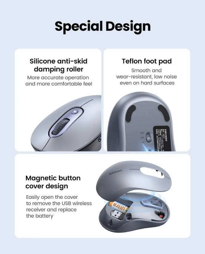 Với kích thước 105mm x 58.5mm x 38mm, chuột UGREEN M556 có thiết kế vừa vặn với lòng bàn tay, giúp người dùng thoải mái khi sử dụng trong thời gian dài mà không bị mỏi tay. Trọng lượng nhẹ chỉ 130g (bao gồm pin) mang lại trải nghiệm di chuột mượt mà.
