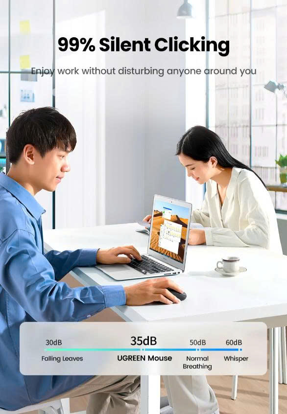 Chuột UGREEN 35900 sử dụng công nghệ kết nối không dây 2.4G tiên tiến, đảm bảo tín hiệu ổn định, không bị gián đoạn trong quá trình sử dụng. Chỉ cần cắm đầu thu USB vào máy tính, chuột sẽ tự động kết nối mà không cần cài đặt phức tạp.