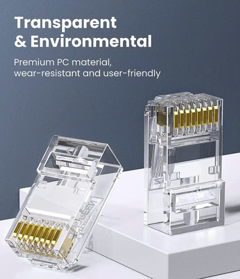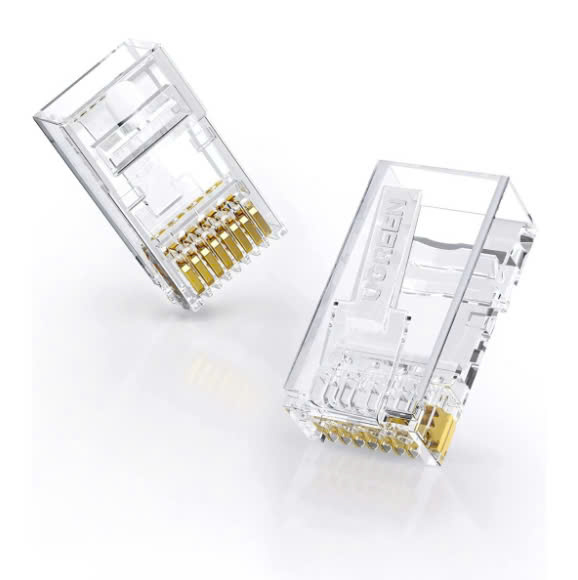 - Hạt mạng RJ45 cat5e Ugreen 50246 làm từ nhựa trong dẻo. Chân tiếp xúc từ đồng nguyên chất, đầu nối mạ vàng 24K chống rỉ.