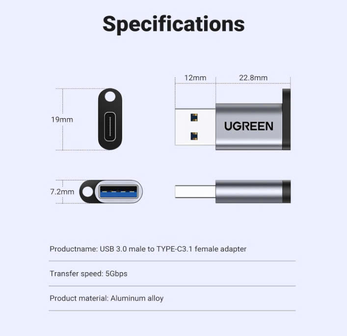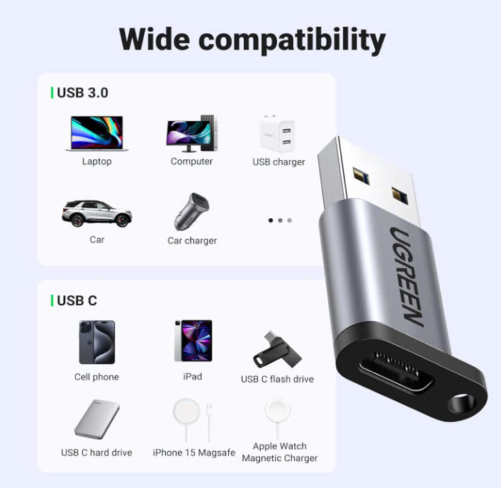 - Đầu chuyển đổi USB 3.0 to USB type-C chính hãng Ugreen 50533 Sử dụng đồng bộ dữ liệu máy tính và điện thoại, máy tính bảng có USB Type C. Bạn có thể lấy ảnh từ thiết bị, copy sao chép nhạc, trao đổi dữ liệu giữa các thiết bị…