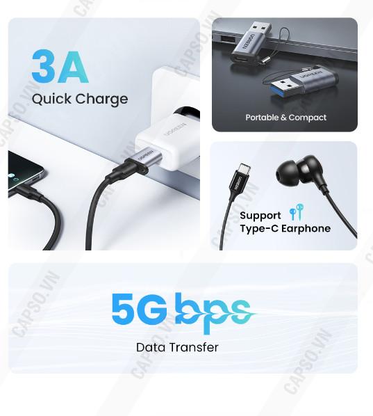 - Đầu chuyển đổi USB 3.0 Type C Ugreen 50533 chính hãng sử dụng cho điện thoại, máy tính bảng, Macbook 12 inch, Google ChromeBook Pixel... với tốc độ truyền dữ liệu lên đến 5Gbps.