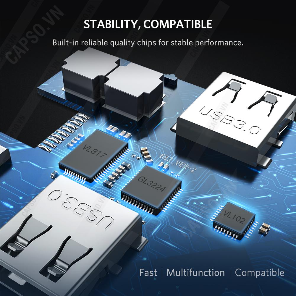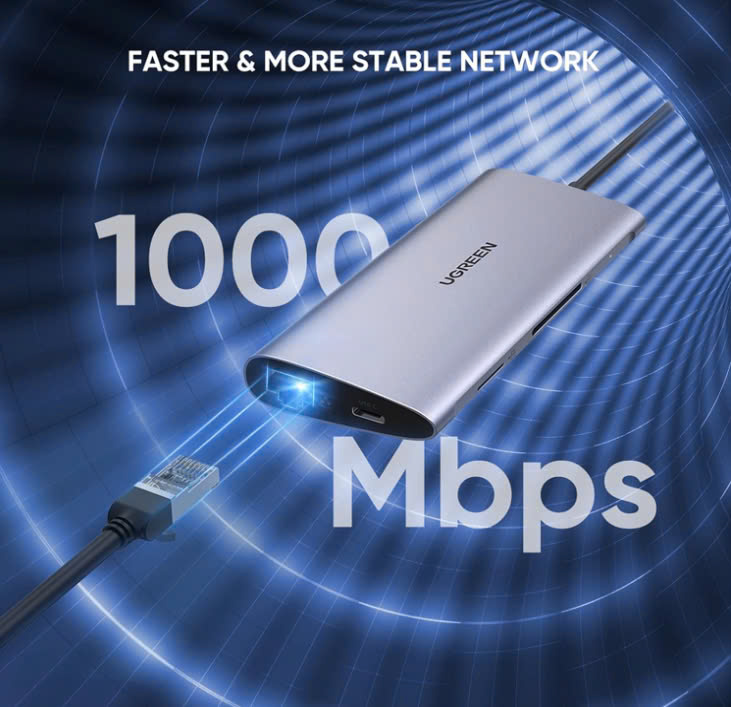 Hub USB Type-C 8 Cổng HDMI/USB 3.0/SD/TF/LAN Gigabit Ugreen 50538 trang bị cổng LAN Gigabit RJ45 giúp bạn kết nối mạng tối đa 10/100 /1000Mbps, cho phép bạn tận hưởng truy cập internet nhanh hơn và ổn định hơn.