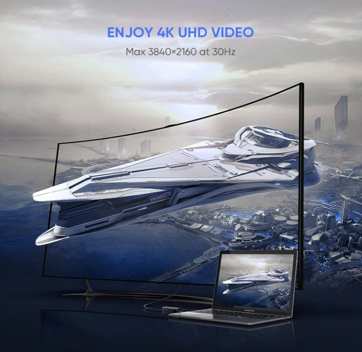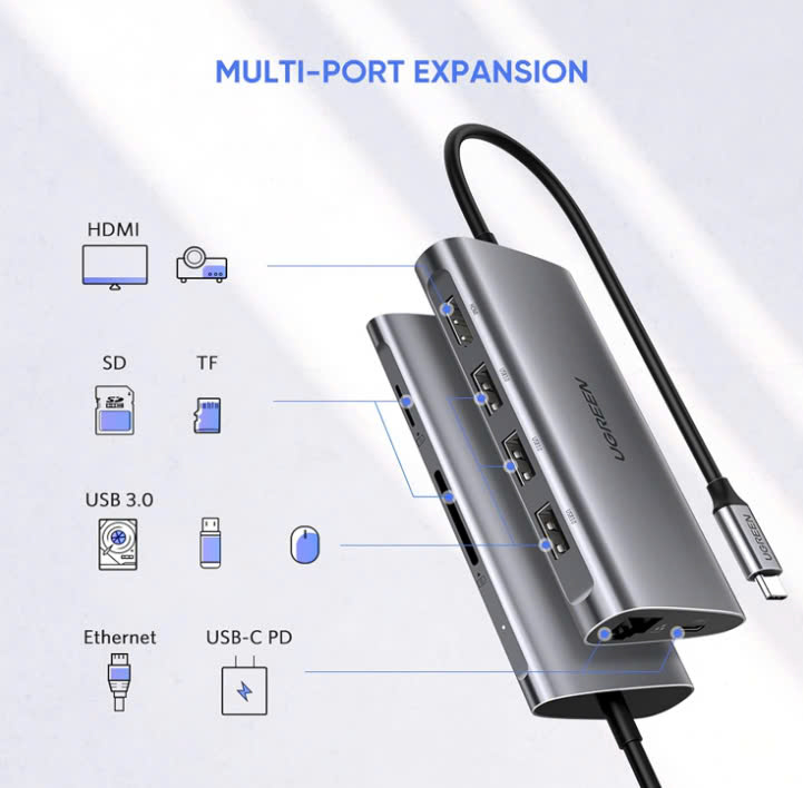 Hub USB Type-C 8 Cổng HDMI/USB 3.0/SD/TF/LAN Gigabit Ugreen 50538 là giải pháp hoàn hảo giúp bạn kết nối, truyền tải hình ảnh từ Laptop đến màn hình PC, T với độ phân giải lên đến 4K/30hz (4096x2160p).