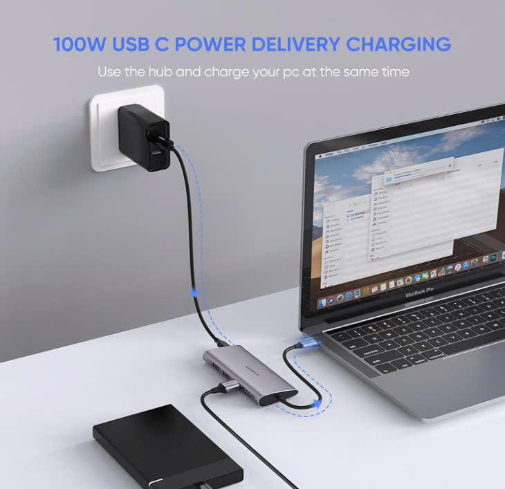 Hub USB Type-C 8 Cổng HDMI/USB 3.0/SD/TF/LAN Gigabit Ugreen 50538 tích hợp cổng USB Type-C hỗ trợ sạc Power Delivery lên đến 20V-3A, hỗ trợ sạc cho Macbook, ChromeBook Pixel và tất cả các Laptop có chuẩn sạc PD thông qua cổng USB Type-C.