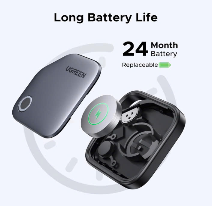- Pin thay thế 2 năm: Không giống như các thiết bị tìm đồ vật khác có pin không thể thay thế hoặc tuổi thọ ngắn, Thẻ tìm đồ vật UGREEN có chip công suất thấp tích hợp và pin cúc áo CR2032 có thể thay thế. Thẻ theo dõi Bluetooth có thể sử dụng tới 2 năm và bạn có thể kiểm tra mức pin bất kỳ lúc nào thông qua ứng dụng Find My.
