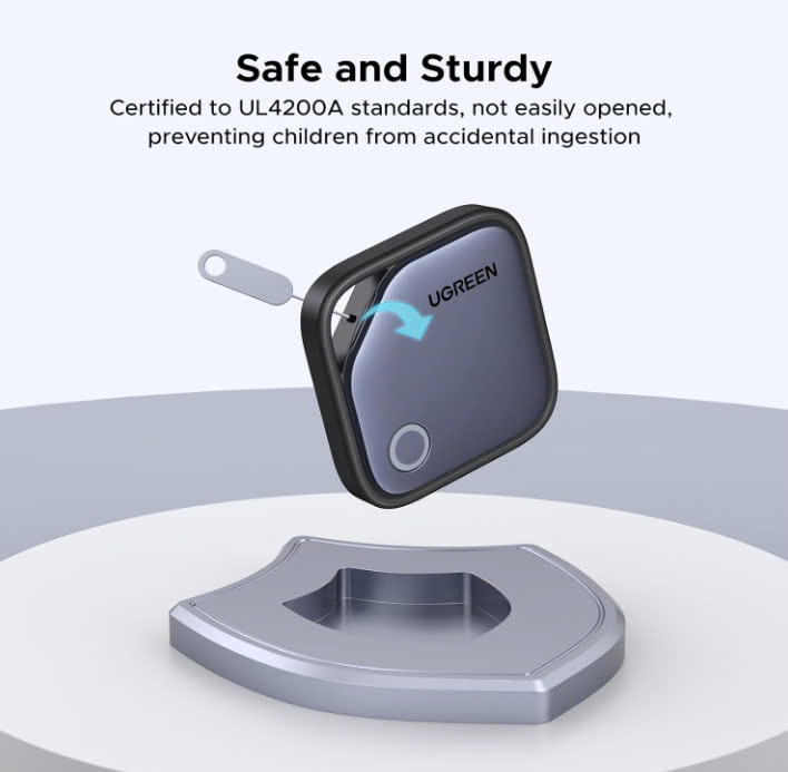 - Chứng nhận an toàn với thiết kế chống trẻ em: UGREEN FineTrack Smart Finder đã đạt chứng nhận UL4200A, có thể ngăn trẻ em dễ dàng mở nắp và vô tình nuốt phải pin cúc áo. Cấu trúc an toàn và chắc chắn, đảm bảo rằng thẻ thông minh Bluetooth có thể chịu được va đập và bảo vệ tốt hơn sự an toàn của gia đình và tài sản của bạn.