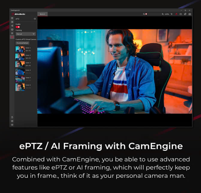 - Các tính năng AI: Tương thích với ứng dụng CamEngine của AVerMedia, Live Streamer CAP 4K cho phép bạn sử dụng các chức năng nâng cao như ePTZ và AI Framing để cải thiện video cho bạn và bất kỳ ai mà bạn đang phát trực tuyến cùng
