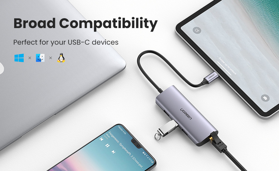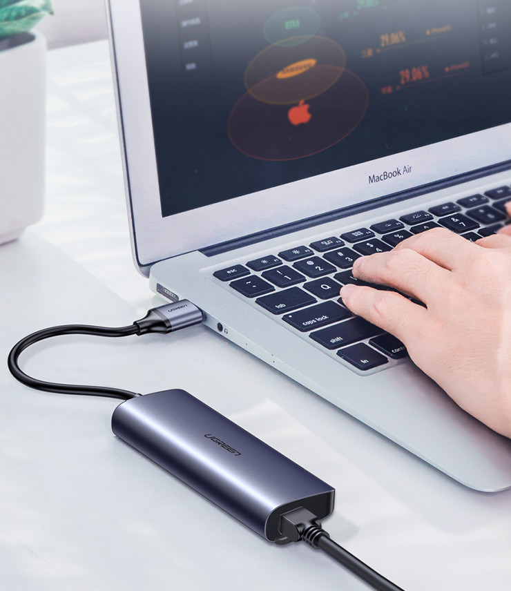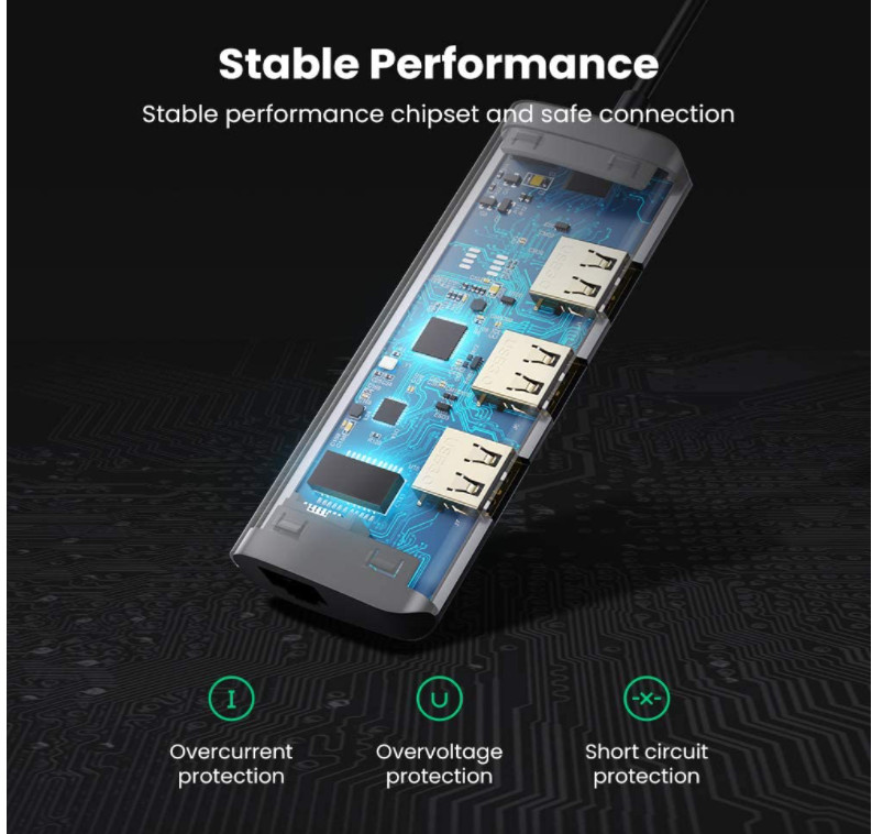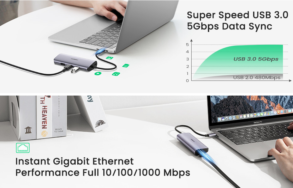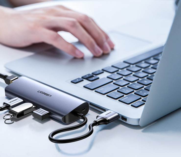 Bộ chuyễn Ugreen 60718 có 3 cổng USB 3.0 để đồng bộ nhanh: Bộ chuyển đổi ethernet hub USB C hỗ trợ siêu tốc độ lên đến 5 Gbps, truyền một bộ phim HD trong vài giây. 3 cổng USB 3.0 Hub bổ sung đơn giản giúp kết nối nhiều phụ kiện hơn như chuột, bàn phím, Ổ đĩa ngoài, Ổ đĩa ngón tay cái với cổng USB A truyền thống, hỗ trợ đồng bộ hóa dữ liệu lên đến 5Gbps, biến nó trở thành Hub Loại C rất thiết thực và hữu ích cho bạn, hoàn hảo để sử dụng hàng ngày.