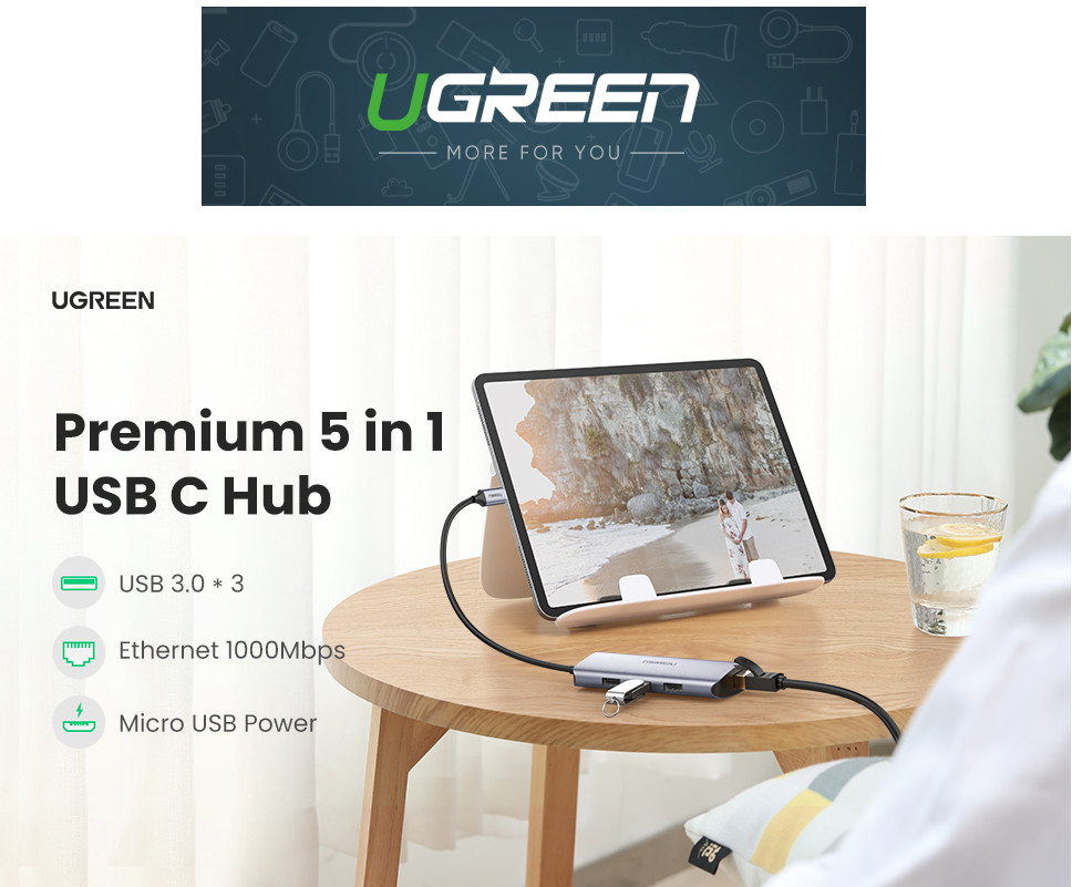 Micro USB trên hub Ugreen 60718 giúp cho nguồn điện ổn định: Cổng micro USB 2.0 được thiết kế chỉ để cấp nguồn cho bộ chia USB loại c này khi kết nối các thiết bị tiêu tốn điện năng như USB HDD. Nó cung cấp tổng nguồn tối đa 5V 2.4A cho bộ điều hợp trung tâm mạng này.