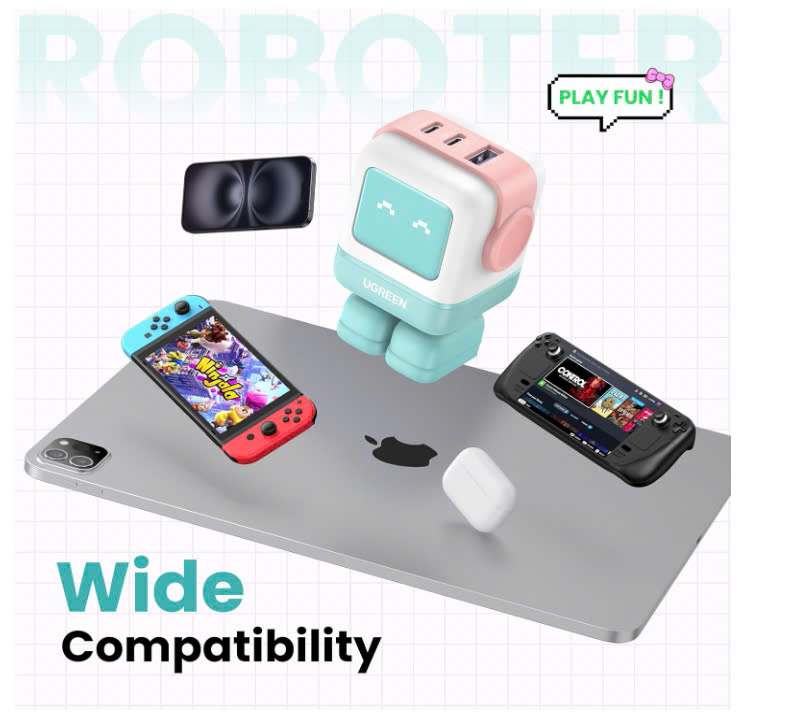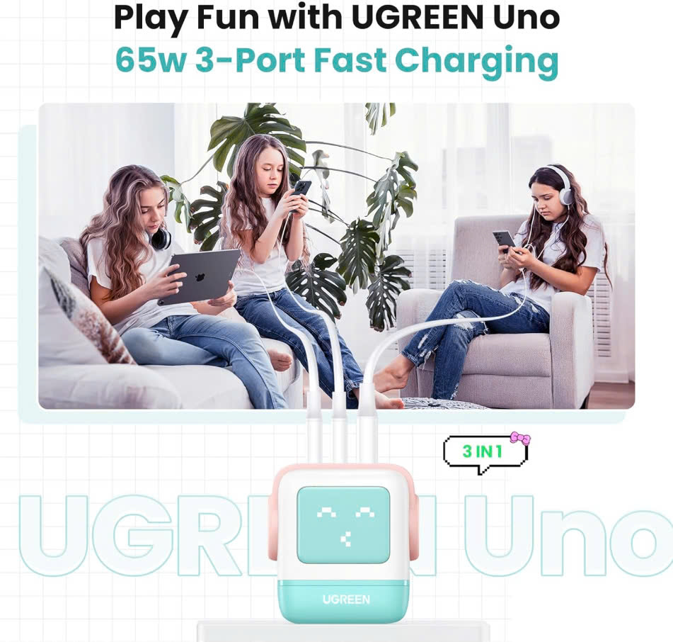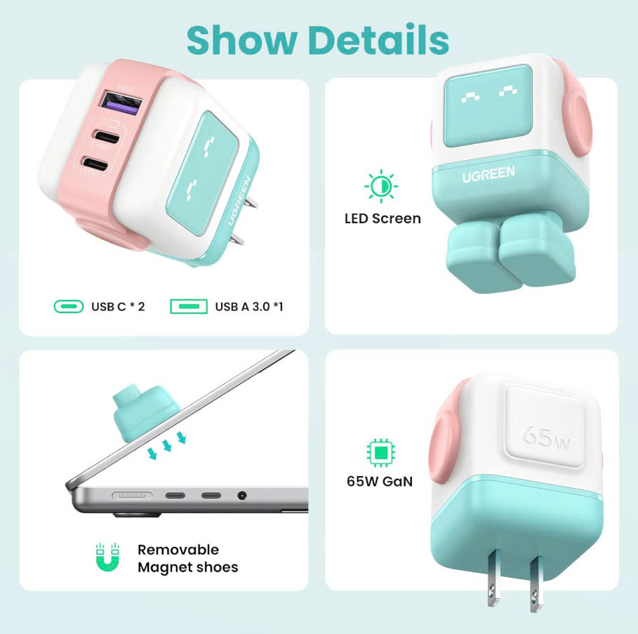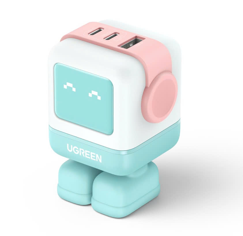 Củ sạc nhanh Robot GaN Nexode RG 65W Ugreen 35856 CD361 2x USB-C 1x USB-A Màu Xanh Hồng