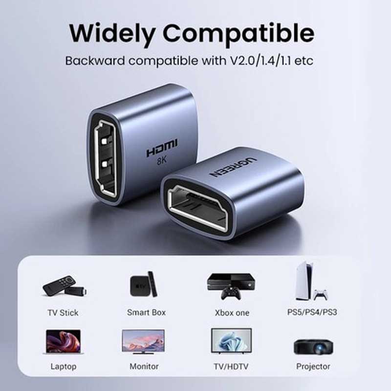 - Đầu nối Ugreen 90592 là phụ kiện giúp bạn nối tiếp hai sợi cáp HDMI 2.1 mà vẫn giữ nguyên chất lượng hình ảnh, âm thanh gốc. Đầu nối cáp HDMI Ugreen 90592 hỗ trợ độ phân giải cao hơn 8K 60Hz và tương thích với 8K 50Hz, 4K 120Hz, 4K 100Hz, v.v. Apdaptor nối HDMI 8K HDMI 2.1 này hỗ trợ băng thông lên tới 48Gbps, nhanh hơn nhiều so với HDMI 2.0 và HDMI 1.4. Ugreen 90592 hỗ trợ 3D và 7.1 5.1, HDR DTS Dobly Atmos Dobly Vision, Audio Return Channel (ARC), HDMI Ethernet Channel (HEC), HDCP.
