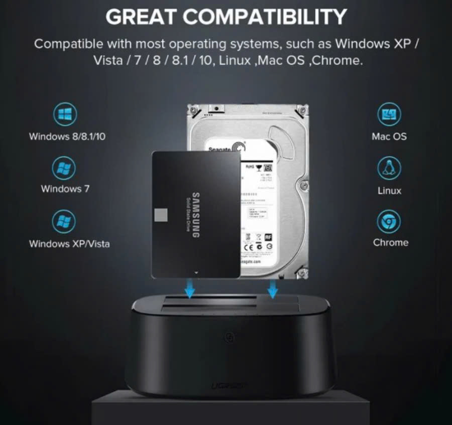- Hỗ trợ kết nối cùng lúc ổ cứng 2.5″ 3.5″ SATA I II III SSD HDD lên đến 12 TB
