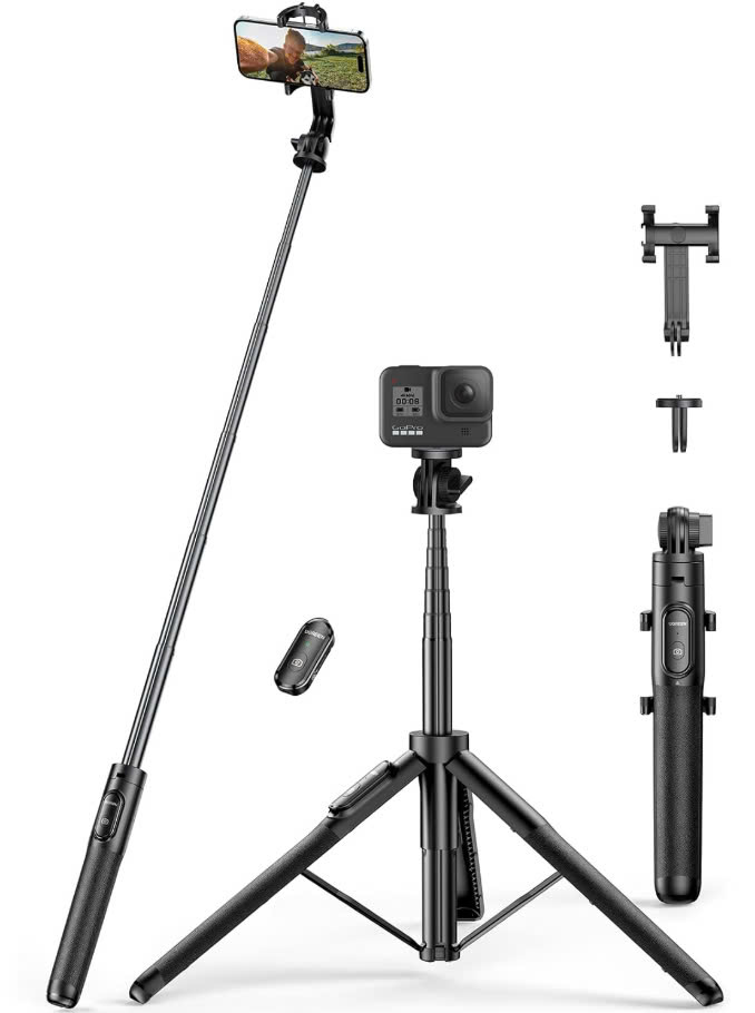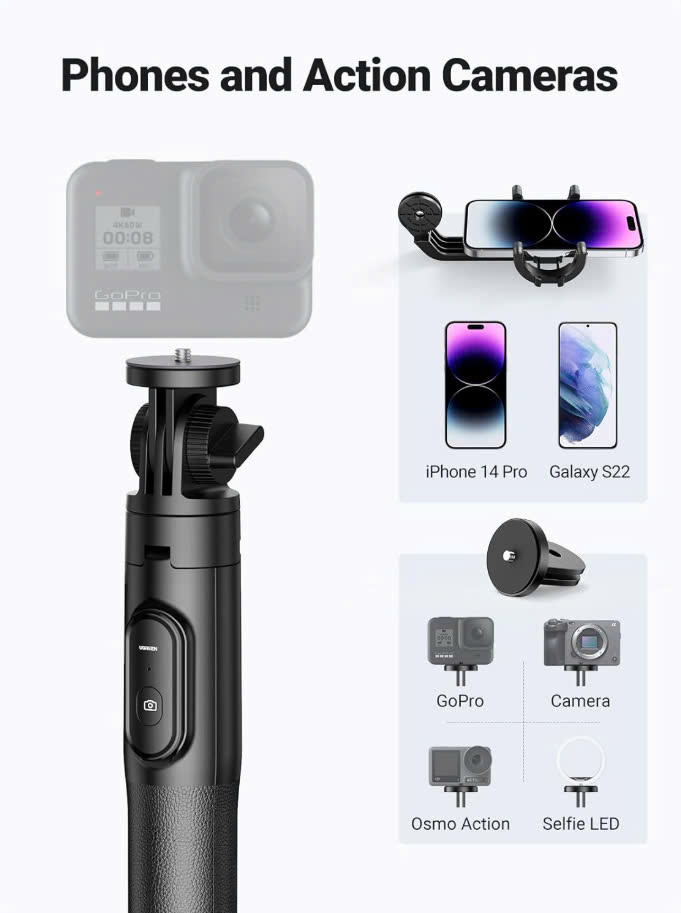 - Gậy tự chụp ảnh và kẹp điện thoại có Bluetooth Ugreen 15062 LP586, được trang bị kẹp có phạm vi co giãn 5,8-8,2cm (điện thoại + ốp lưng), chân máy điện thoại nâng cấp này phù hợp với điện thoại thông minh 4,7-6,1 inch chạy iOS (5.0 trở lên) và Android (4.0 trở lên), tương thích với dòng iPhone, dòng Galaxy, dòng Redmi, dòng HUAWEI, v.v.