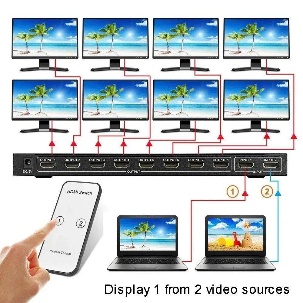 Bộ chia HDMI chuẩn 1.4b, 2 ngõ vào 8 ngõ ra. Hỗ trợ 3D, độ phân giải lên tới 1080P@60hz, 4K@3Hz
