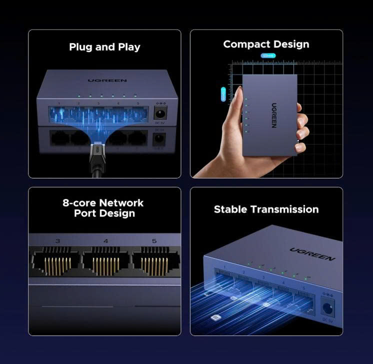 - Bộ chuyển mạch Ethernet UGREEN không cần cài đặt trình điều khiển và dễ sử dụng, đảm bảo kết nối mượt mà với nhiều thiết bị. (Không hỗ trợ PoE)